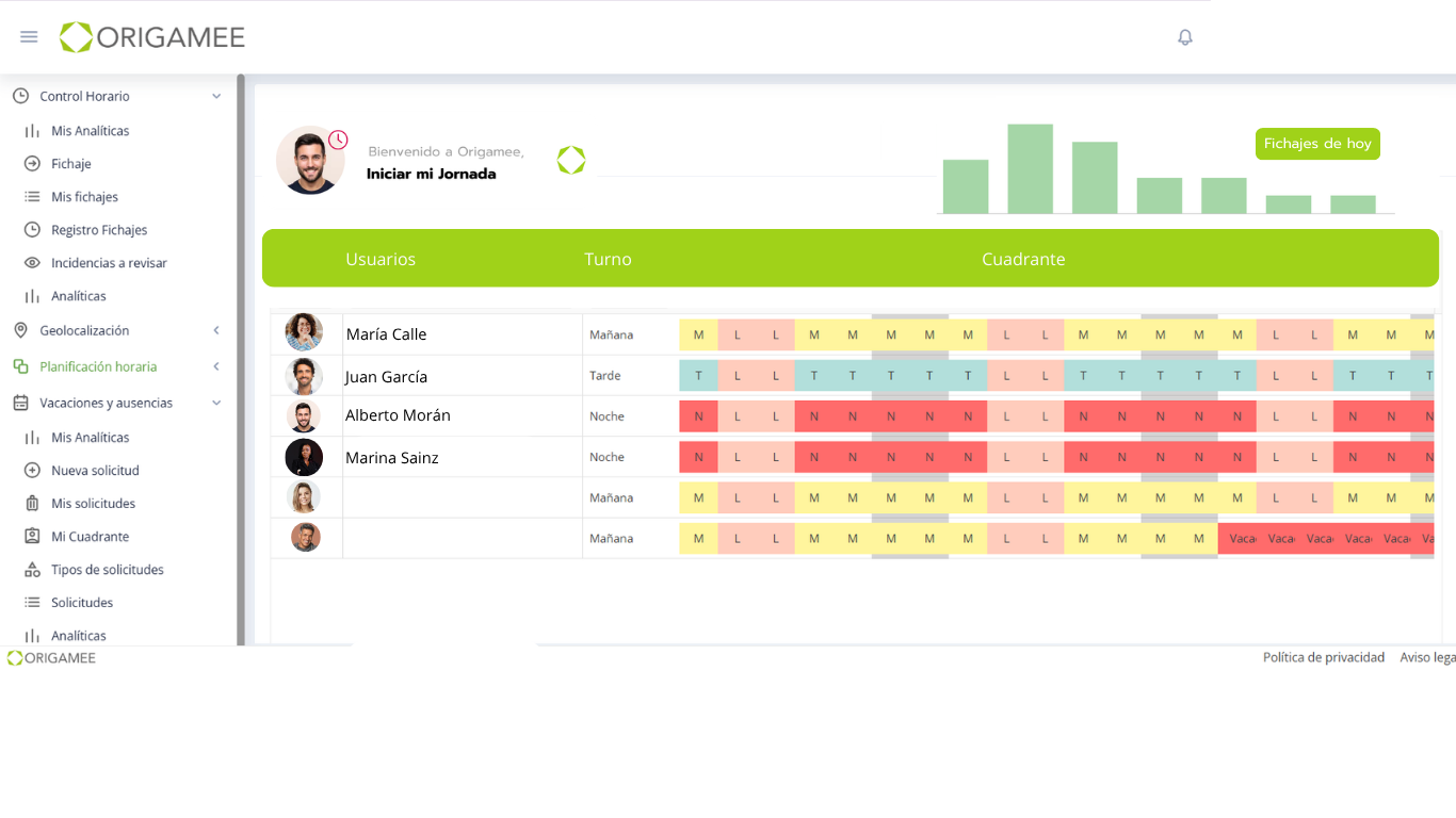 Registrar jornadas, cuadrar turnos o aprobar ausencias. Origamee centraliza toda tu operativa en una única plataforma para que olvides el papeleo y te enfoques en tu equipo.